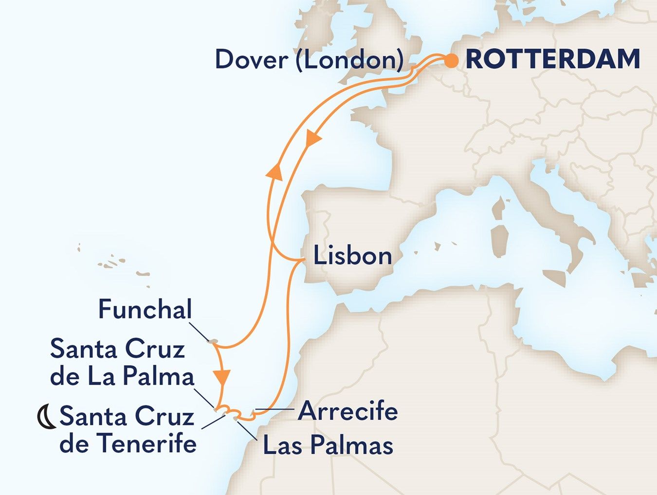 Deze cruise neemt u mee naar zuiderse bestemmingen zonder dat u op het vliegtuig hoeft te stappen! Het schip vertrekt namelijk vanuit Rotterdam en komt daar na twee weken terug aan. Onderweg krijgt u de gelegenheid om Madeira, Portugal en de Canarische Eilanden te bezoeken. In de Canarische Eilanden zelf meert het schip aan in Tenerife, Gran Canaria, La Palma en Lanzarote. Tot slot staan ook Lissabon en Dover op het reisprogramma. Het schip, de Nieuw Statendam behoort tot de nieuwste generatie schepen van Holland America Line. Het schip heeft uitstekende restaurants, gastvrij personeel en alle nodige voorzieningen voor aan aangename vakantie.